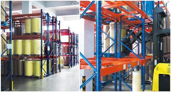 普通叉車搭配:一整棟式貨架,沒有專門的叉車通道,由叉車駛入貨架內部存取貨物。