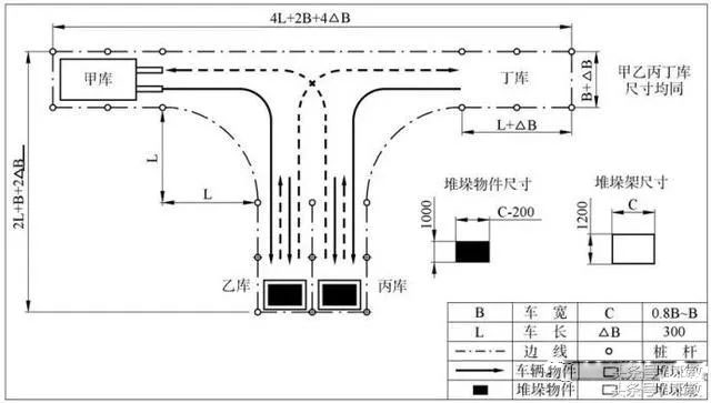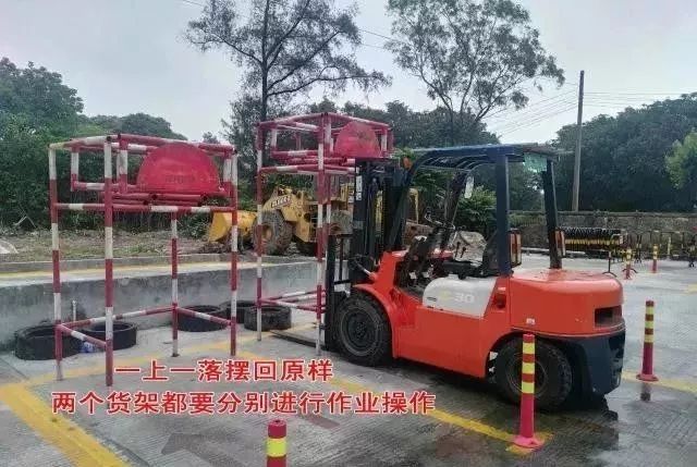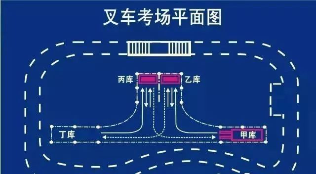 作業:乙庫的貨架(高的那個)入叉叉貨以后倒車直接升到頂(油缸提升的時候要加油提速,不要怠速提升),放下后稍微停一下,馬上又提升放回下層,然后倒車入丁庫,入庫時只要求整車身入庫,入庫后,貨叉要放到地,不然要扣分。丙庫的貨架一樣的操作,貨架放地上以后,倒車回甲庫起點,貨叉也要入庫,謹記貨叉要后傾并提升至離地20-40cm。