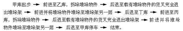 (作業要點:加油提升,倒車貨叉要后傾要提升,丁庫放叉)